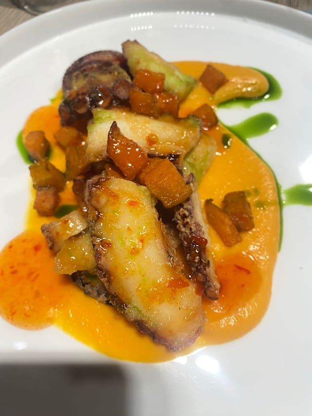 Polpo croccante, crema di patate dolci, sweetchilly e prezzemolo