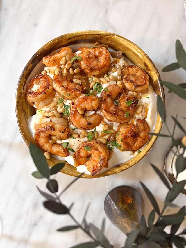 - Gambas, salsa de yogur, berengena, pan libanés crujiente y piñones