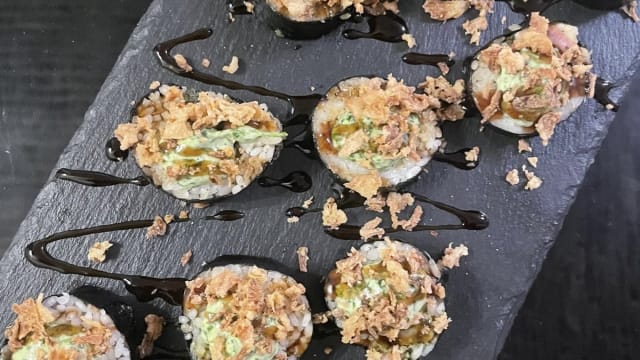 Maionese al mojito, alga, riso, tartare di fassona e granella di pistacchio