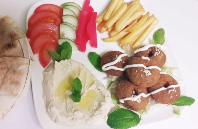 - 4 pieces falafels, houmous, Salade crème de sésame, riz où frites.