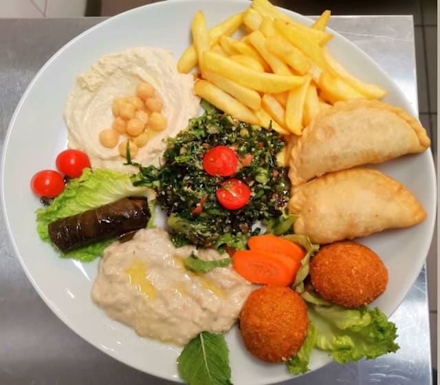 - Houmous, Caviar de aubergine, Harissa, salade,1 feuilles des vignes, 4 sambousek (olives vertes pimentées, fromage épinards, viande) 1 kebbe, 1 falafel