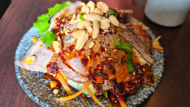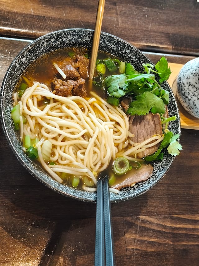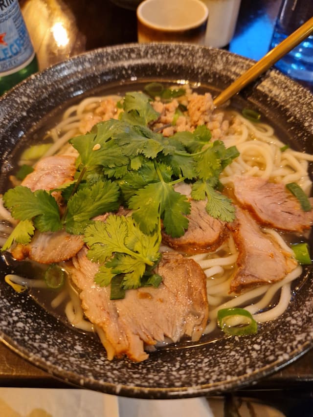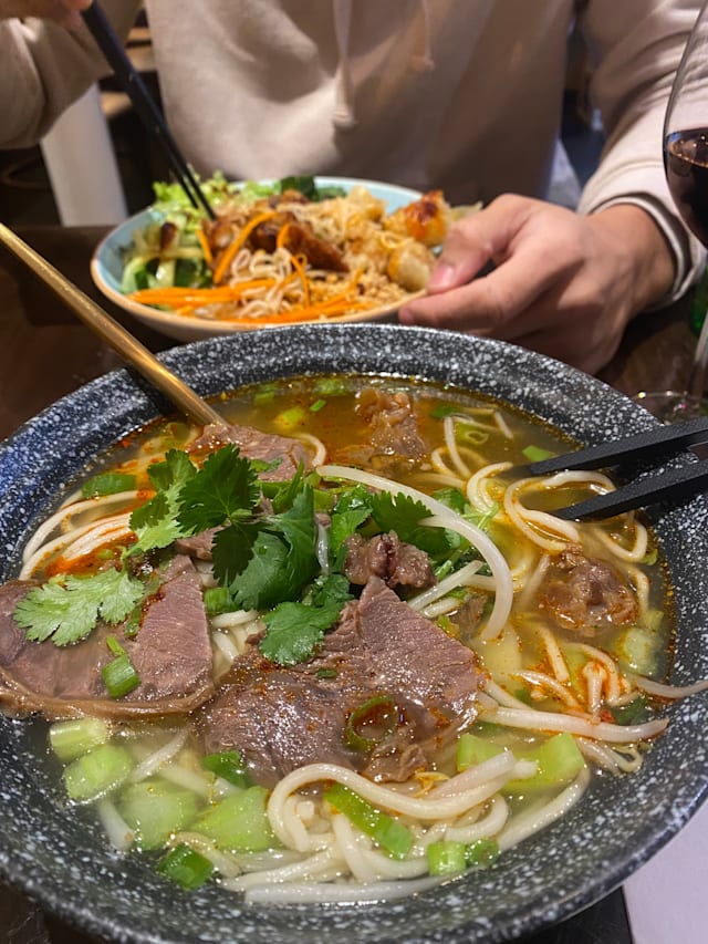 Bouillon de poulet et boeuf cuisson longue durée, nouille faite maison, ragoût de boeuf et lamelles de boeuf, coriandre, ciboulette, céleri, pousse de soja