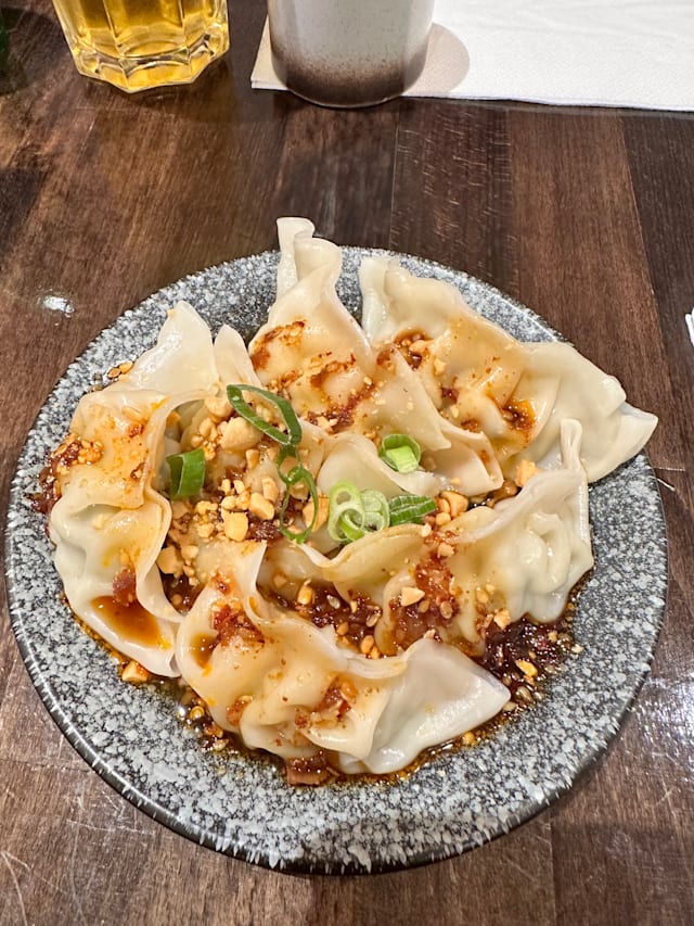(Bouillon de poulet cuisson longue durée)Nouille faite maison, porc haché et lamelles de porc, coriandre, ciboulette, céleri, pousse de soja
