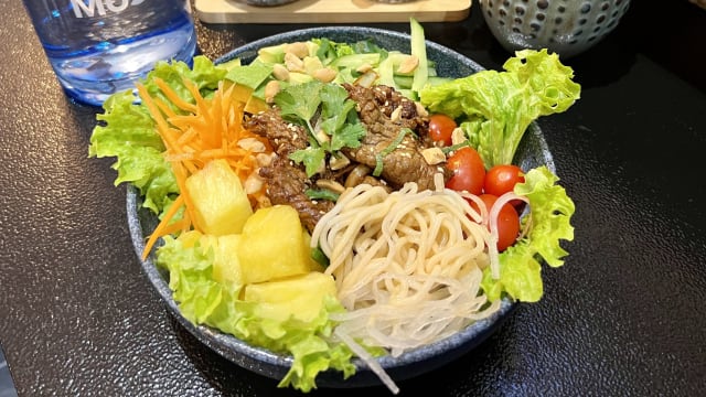 Bouillon de poulet et boeuf cuisson longue durée, nouille faite maison, ragoût de boeuf et lamelles de boeuf, coriandre, ciboulette, céleri, pousse de soja