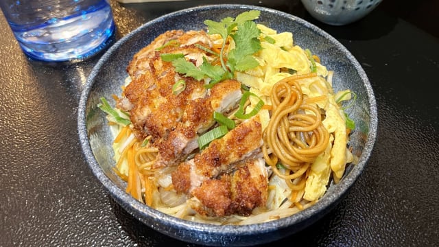 Poulet au miel, nouille, choux, oeufs, carottes, pousses de soja, oignons, ciboulettes