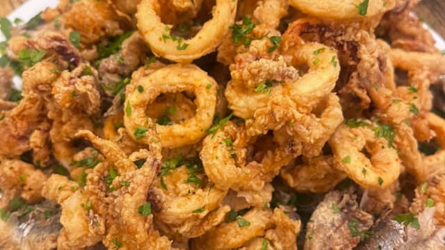 Gamberetti marinati,pepata di cozze,calamari fritti, caponata di pesce, cocktails di gamberetti,insalata di polpo marinata all'arancia ,alici marinate ,polpettine di pesce, bruschetta classica 2.0, sarda a becca fico. La disponibilità di tutte le pietanze elencate è in base al fresco del giorno