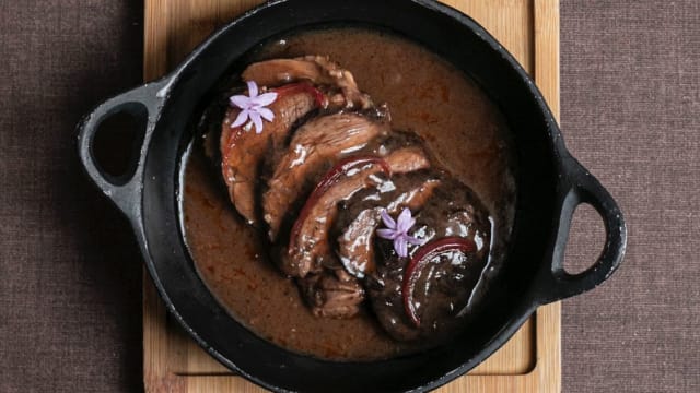 Picanha asada y confitada en vino tinto, panela y especias, acompañada de arroz con coco titote.