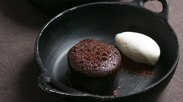 Mousse de chocolate y milo con bizcocho de avellanas.