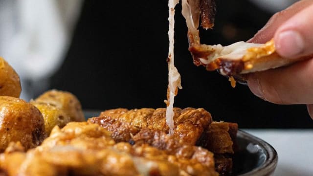 Costillitas de cerdo confitadas a baja temperatura con BBQ de tamarindo y panela, acompañadas de yuca frita.