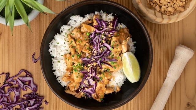 - Servi avec riz parfumé et poulet, sauce onctueuse à la cacahuète, relevée au curry avec une pointe de citronnelle.