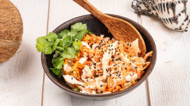 - Servi avec base de salade et vermicelles, poulet sous une sauce onctueuse à la cacahuète avec une pointe de citronnelle et curry