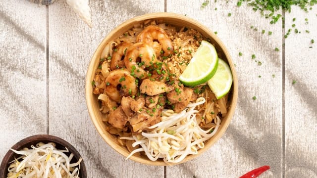 - Nouilles de riz dans une onctueuse sauce de tamarin citronnée, cacahuètes 🥜, cébette, pousses de soja. Servi avec tofu. Pour les végétaliens, merci de préciser si vous ne souhaitez pas l'omelette !