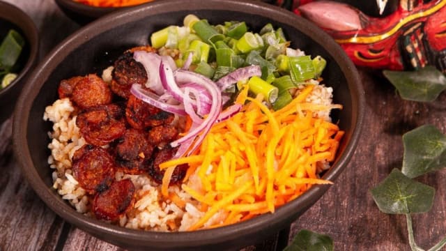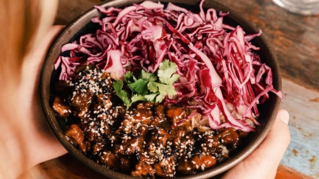 Servi sur riz parfumé. Sauce teriyaki traditionelle, au mirin et saké, avec sésame, ciboulette & chou rouge