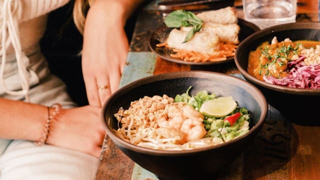 Nouilles de riz dans une onctueuse, sauce de tamarin citronnée, cacahuètes, omelette, cébette, pousses de soja, piment oiseau & citron vert.
