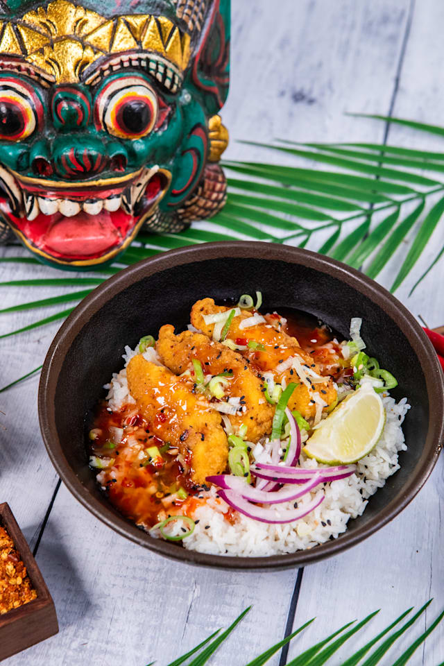 Servi avec du riz parfumé. Poulet pané avec sa sauce sweet chilli légèrement relevée, chou rouge, carottes, concombres, citron et sésame