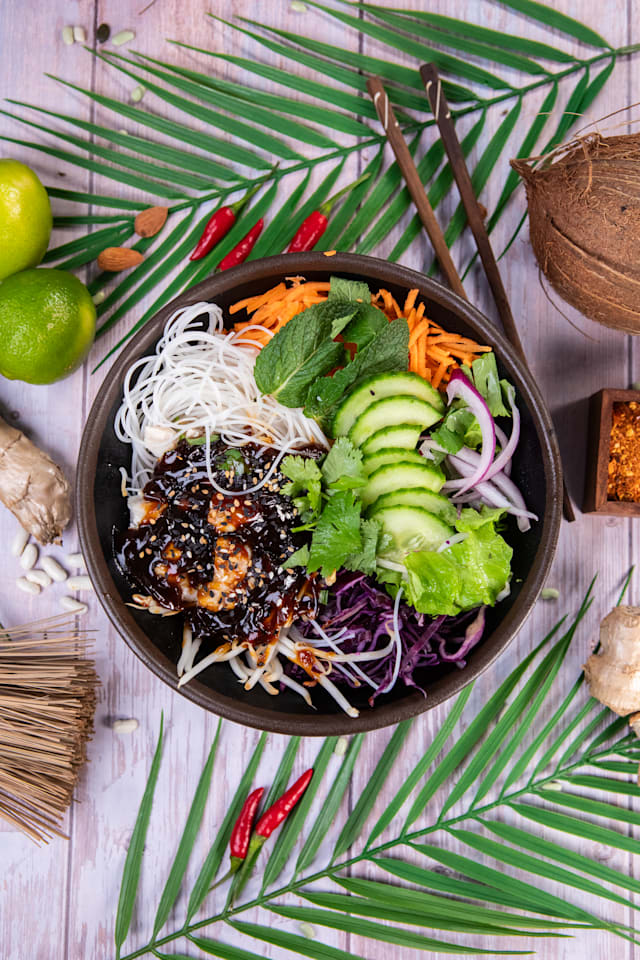 Vermicelles de riz, salade, oignons rouges, concombres, carottes, chou rouge, cacahuètes & menthe. Servi avec un nem.