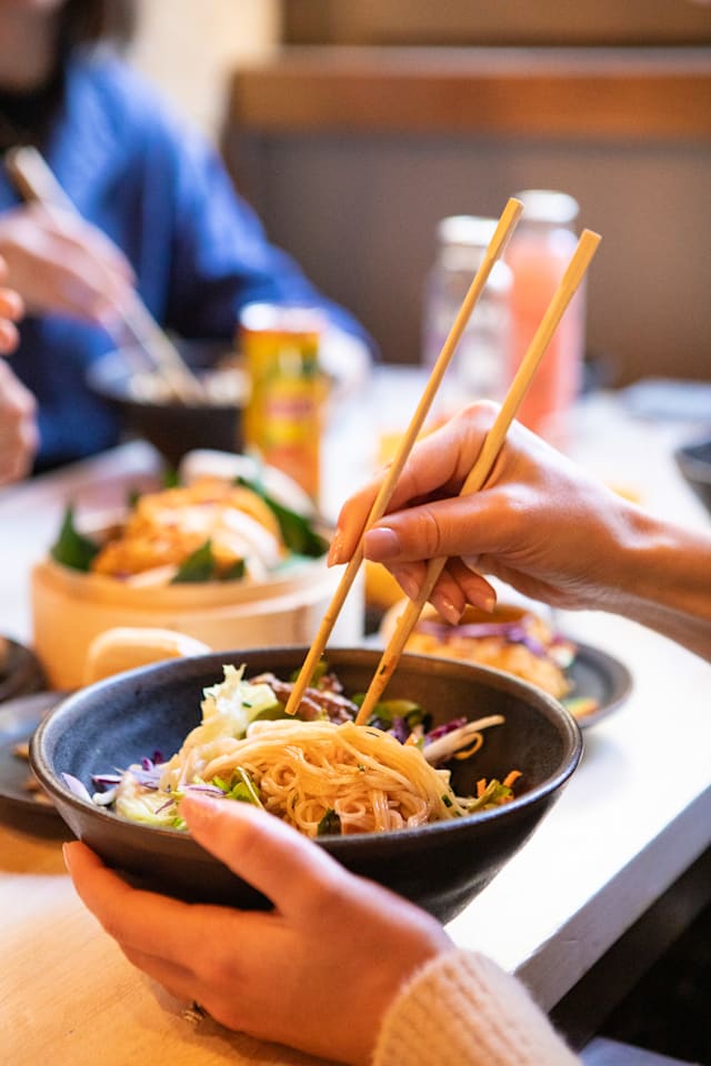 Nouilles de riz dans une onctueuse sauce de tamarin citronnée, cacahuètes omelette, cébette, pousses de soja & citron vert.