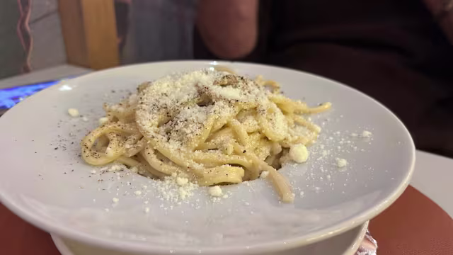 - Polpette al sapore autentico di amatriciana servite con pecorino scorza nera grattugiato e pepe