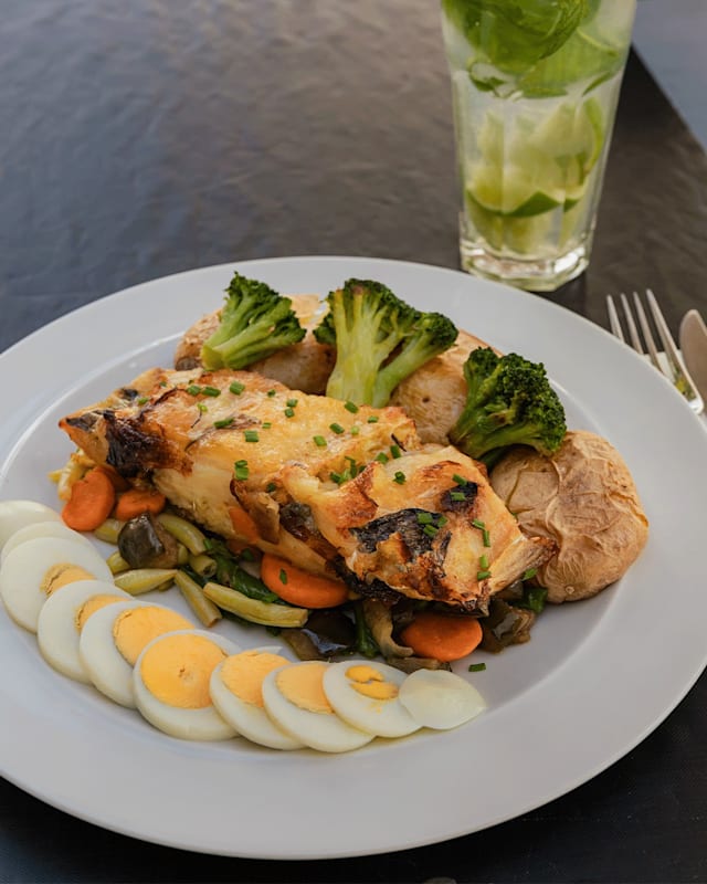 - Bacalhau frito, ovo cozido, pimentos e batatas à portuguesa