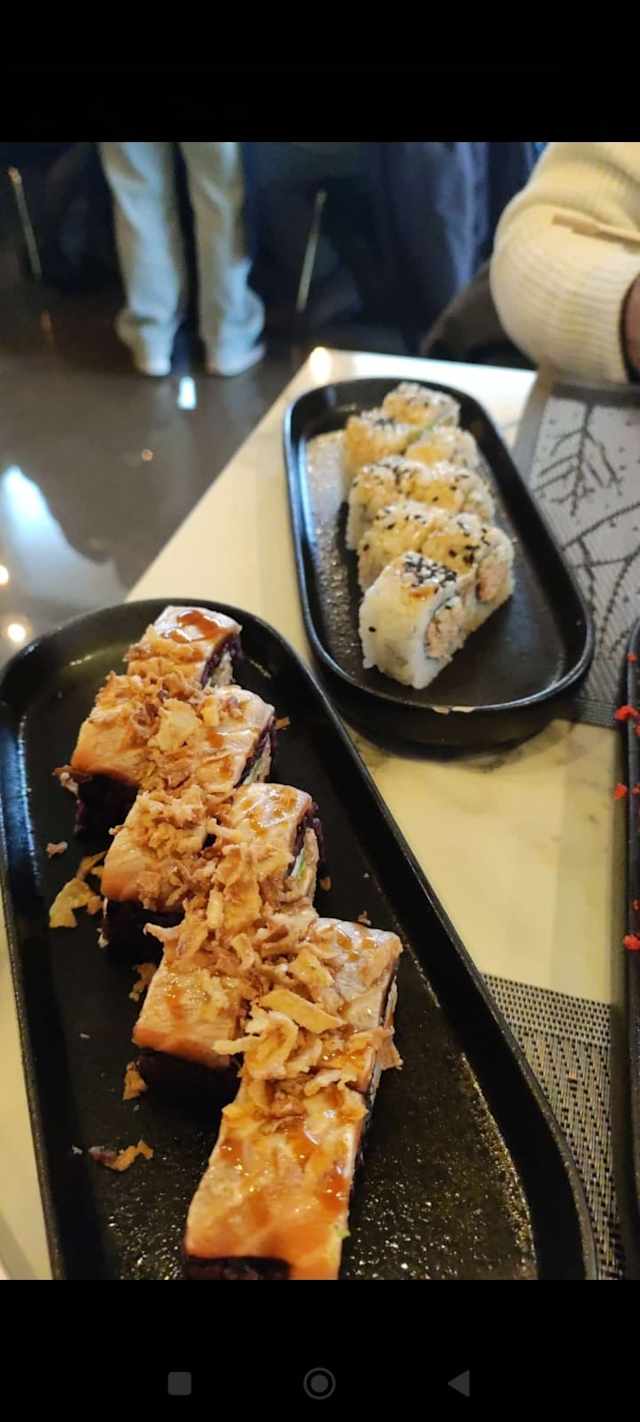 - Riso venere. salmone. avocado mango. gamberi cofti. goma Wakame. edamame.granella di cipolla tritta. salsa teriyaki. salsa di mango