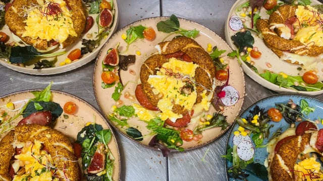 Hummus, pepino, rucula, rábano. Aderezo de limón y tahini, puedes elegir entre atun,huevo revuelto, huevo poche o mozzarella