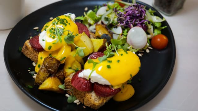 Huevo poche sobre una tostada con chorizo túrco flameado cubierto de salsa holandesa