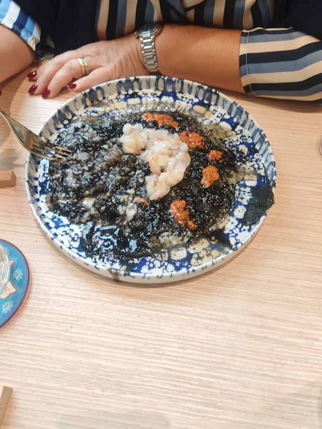 Vialone nano mantecato la burro salato, polvere di nero di seppia, gambero di mazara e ricci