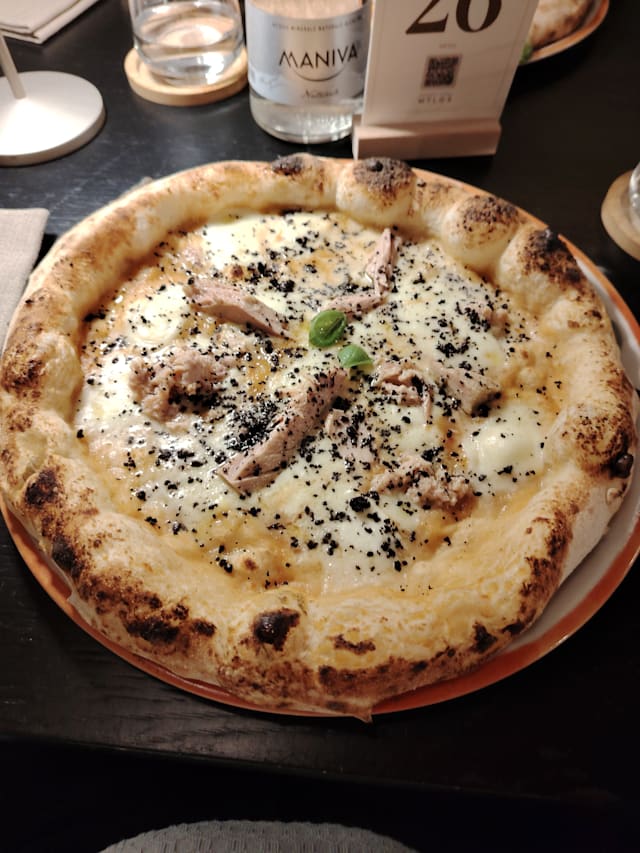 Salsa di pomodoro san marzano, mozzarella fiordilatte, spianata piccante e filamenti di peperoncino