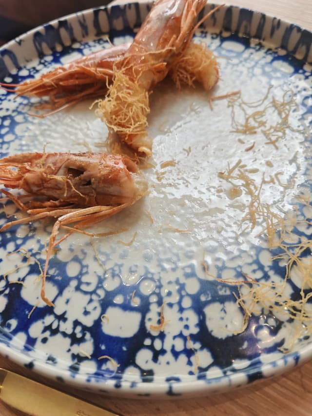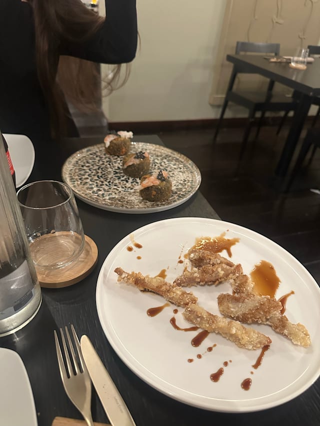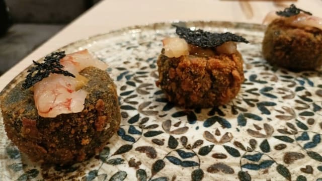 Arancinette al nero di seppia ripiene di burrata servite con maionese di ricci e gambero di mazara