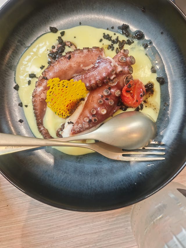 Tentacoli di polpo arrosto con crema di patate allo zafferano, polvere di olive e pomodoro confit