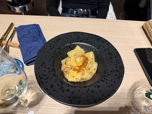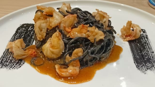 Tagliolino al nero di seppia con gambero rosso di mazara e la sua bisque
