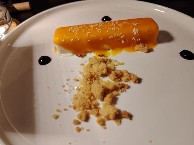 Mousse al cioccolato bianco, gelée al mango, glassa ai frutti di bosco