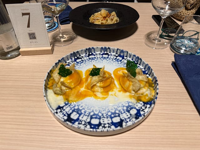 Ravioli ripieni di patata affumicata e ricciola, salsa di zucca rossa, polvere di liquirizia, gocce di provola affumicata e chips di carciofi