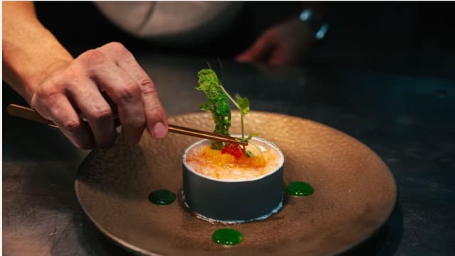 Tartare di gambero rosso di mazara con bufala, marmellata di arancia al peperoncino, nocciole tostate e uova di salmone