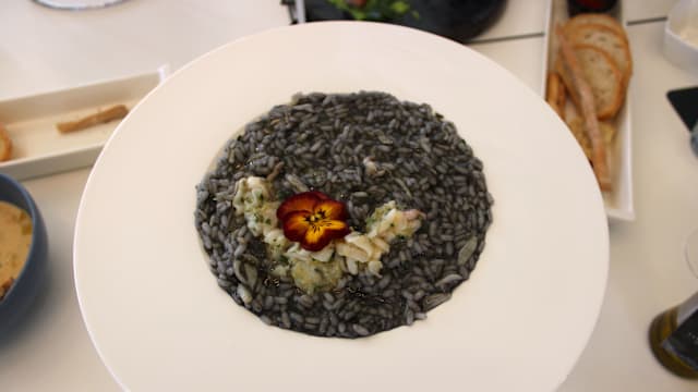 - Raviolo al nero di seppia ripieno di ricotta e gamberi servito su pesto di rucola e con calamari fritto