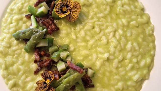 - Risotto con cremoso allo zafferano, tonno scottato e crumble al cioccolato