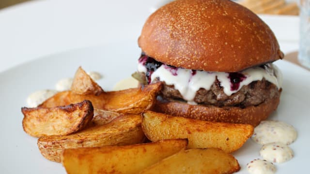 - Hamburger di chianina, pomodoro, lattuga, cipolla arrosto e fonduta di formaggio, panino al latte e patate