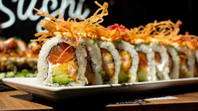 - Sin arroz. Base de plátano macho maduro, salmón, surimi, queso crema y aguacate. Topping de pasta dinamita y salsa anguila.