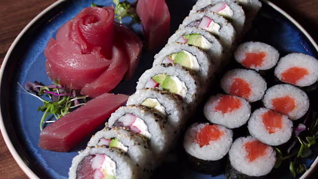 - Arroz de sushi frío y frito. Pez mantequilla marinado en salsa ponzu, atún, pasta dinamita, wakame y gambas rebozadas picadas con salsa de lima.