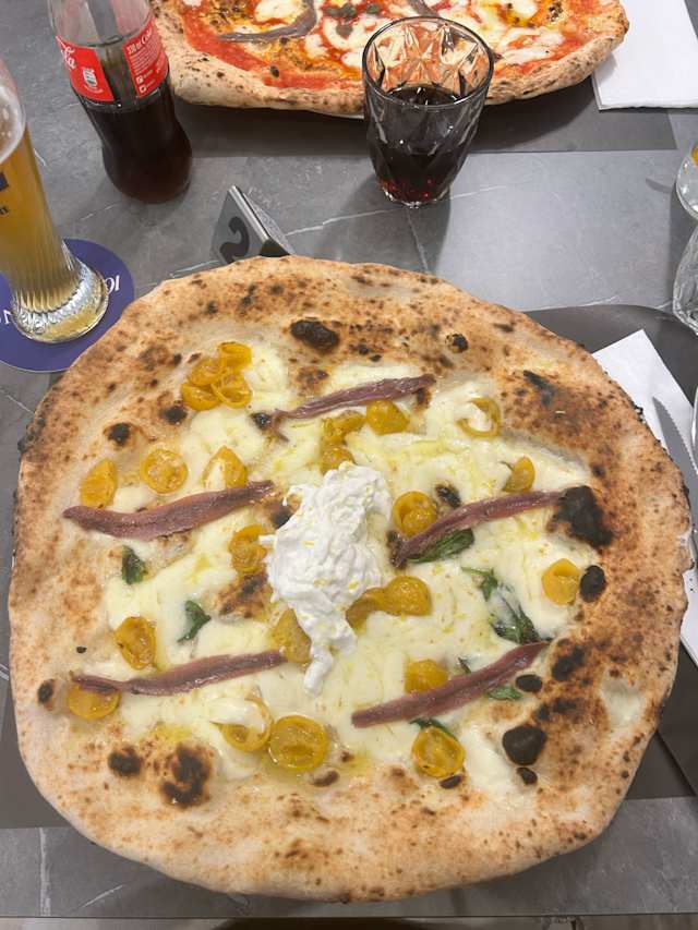 - Pomodoro san marzano, fiordilatte di agerola, capperi, acciughe del cantabrico, origano, basilico e olio EVO