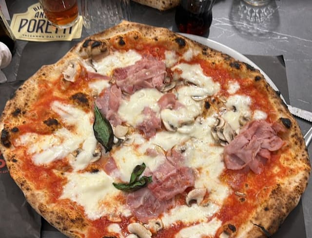 - Pomodoro san marzano, fiordilatte di agerola, prosciutto cotto, funghi champignon, parmigiano 24 mesi, basilico e olio EVO