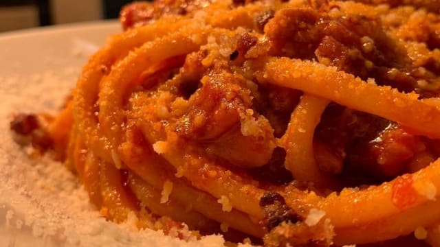 Guanciale del laboratorio artigianale leoni di ariccia, salsa di pomodoro, pecorino romano dop (naturalmente privo di lattosio)...un classico