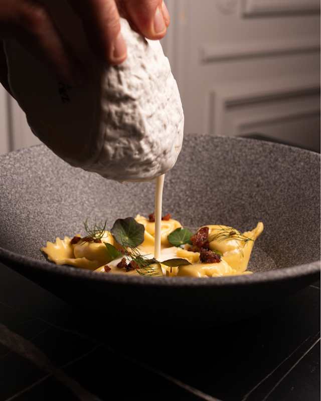 - Calamarata di pasta fresca con crostacei, molluschi e fonduta di pecorino