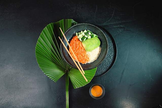 - Dés de saumon, avocat, mangue, riz soufflé, oignon rouge, piment jalapenos, coriandre, menthe, perle de yuzu, sauce ponzu aux 4 agrumes. Servi avec un riz nature ou vinaigré