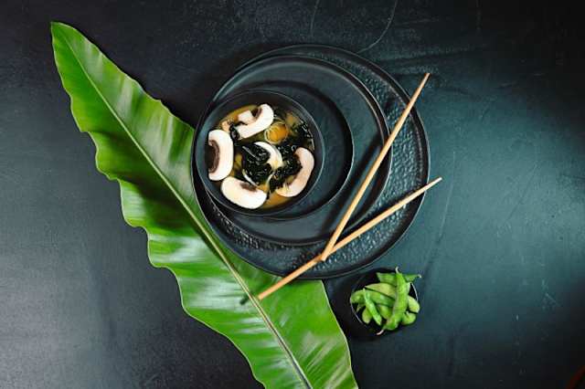 - Salade iceberg, pousse d'épinard, avocat, carotte, edamame, miso séché à la truffe, vinaigrette japonaise