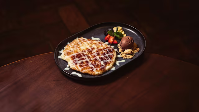 - Crepe tailandesa tradicional servido con helado de chocolate y fruta de temporada con salsa de leche condensada.