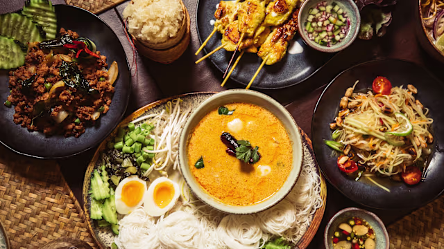 - Ensalada de papaya verde estilo laos, acompañado de huevos, chicharrones de cerdo, vermicelli de arroz, salchicha de pimienta negra, albóndigas de pescado, langostinos, carne de cerdo y verduras.