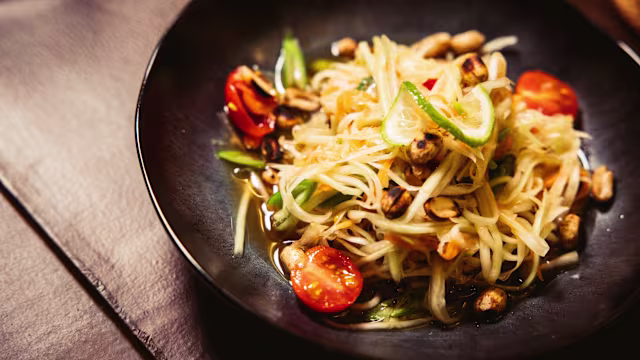 - Ensalada de papaya verde con salsa de anchoas fermentada, zanahoria, tomate y judías verdes.