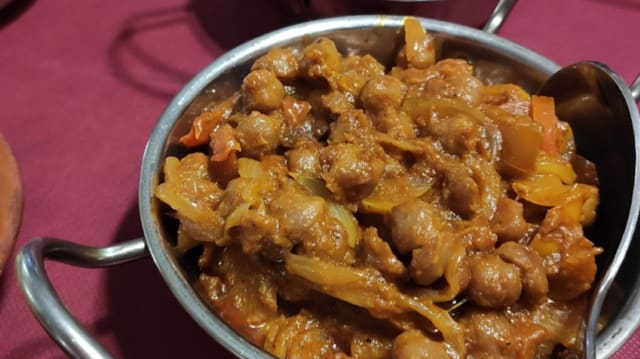 Agnello cotto con cipolle tritate, aglio zenzero ed erbe indiane.