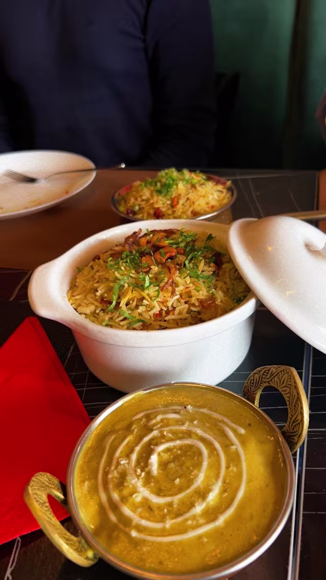 - Arroz basmati cozinhado com camarão, frango e cordeiro, aromatizado com especiarias